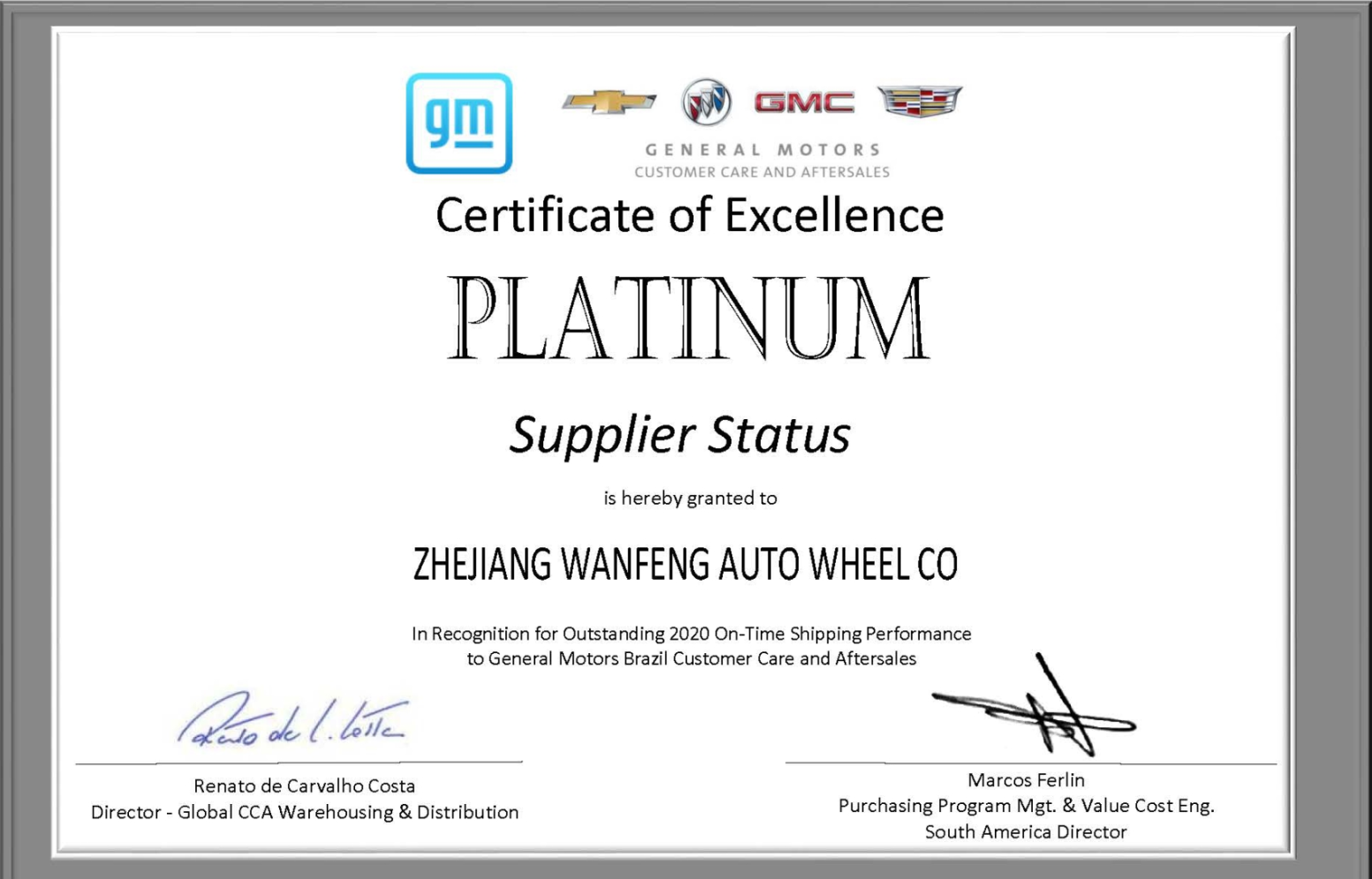 萬(wàn)豐奧威汽輪作為GM的輪轂供應商,一直致力于為客戶(hù)提供滿(mǎn)意的優(yōu)質(zhì)產(chǎn)品和服務(wù)。2020年,在新冠疫情沖擊下,公司各部門(mén)團結互助,科學(xué)施策,迅速復工復產(chǎn),與客戶(hù)保持緊密聯(lián)系,為產(chǎn)品交付做好充分保障。萬(wàn)豐奧威汽輪在巴西GM CCA的項目開(kāi)發(fā)、裝車(chē)、銷(xiāo)售等方面做出的重要貢獻得到了GM的高度評價(jià)。